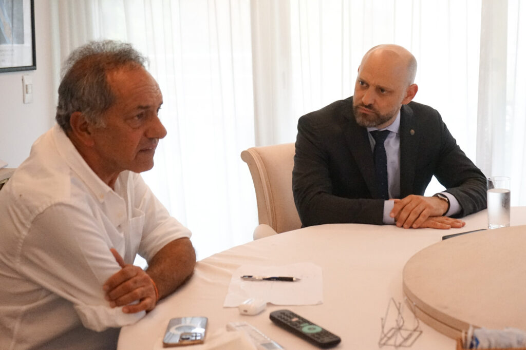 En el marco de una amplia agenda con funcionarios del Ejecutivo Nacional, el ministro de Desarrollo Productivo, Gustavo Puccini mantuvo un encuentro de trabajo con el embajador argentino en Brasil, Daniel Scioli, para repasar la agenda productiva de Santa Fe y los mercados estratégicos que maneja la provincia en el país vecino. Uno de los temas centrales del encuentro fue el impacto de las retenciones que pretende aumentar el Gobierno Nacional con el proyecto de Ley Ómnibus que discute hoy el Congreso. Turismo y nuevos destinos también estuvieron entre los puntos que se abordaron.