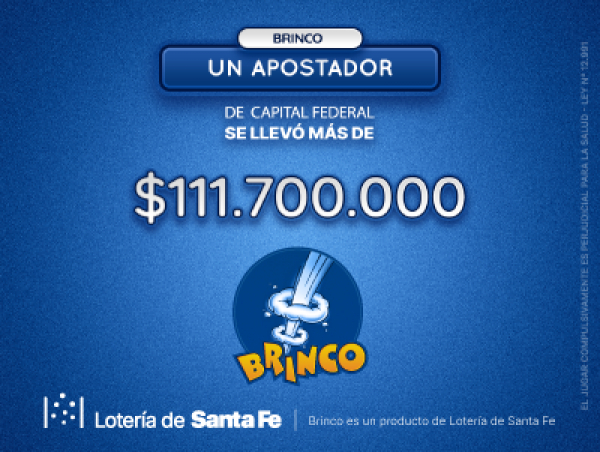 Lotería de Santa Fe les informa que durante el último sorteo de Brinco un apostador con 6 aciertos se adjudicó el premio total del Brinco Tradicional de más de $111.700.000 con los números 00-03-10-19-27-29.