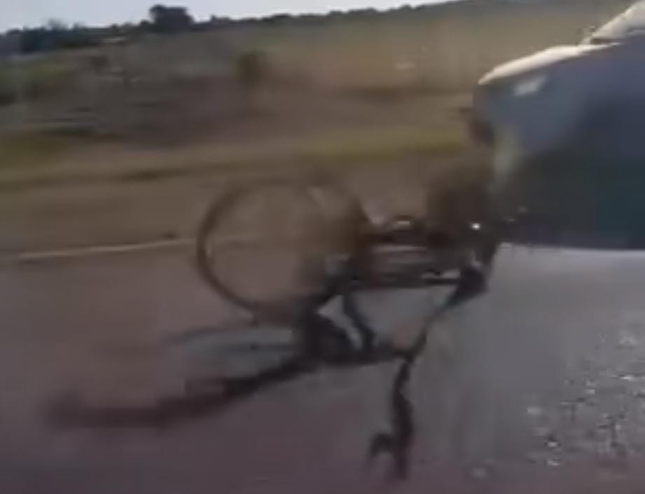 Este martes feriado dos hombres circulaban en moto y en bicicleta «enganchados», por ruta provincial N° 6.