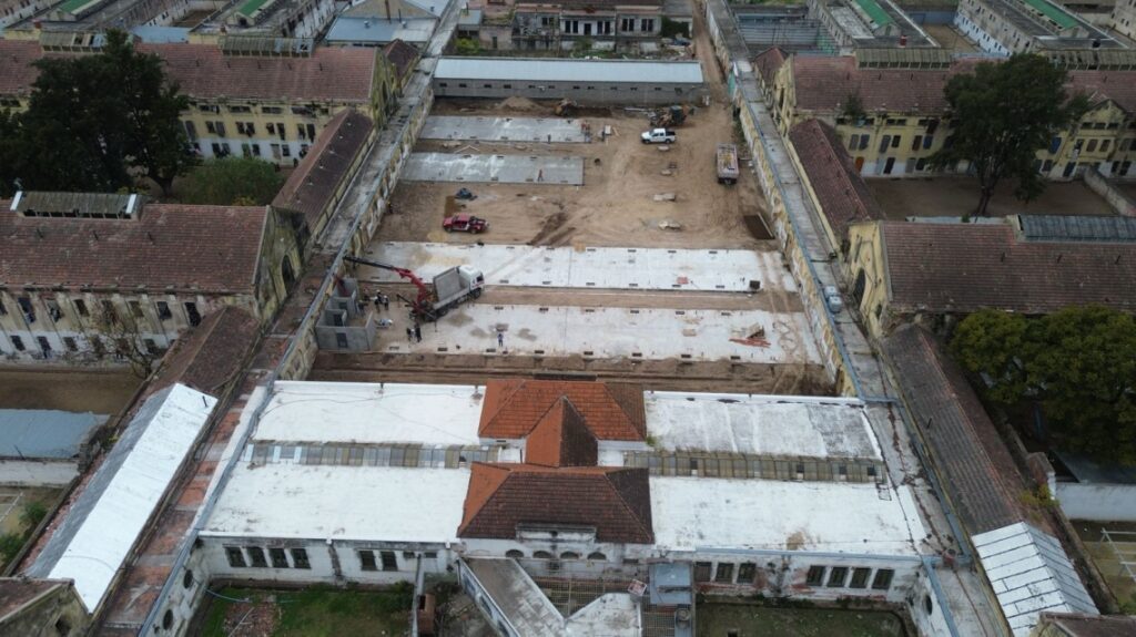 Cabe recordar que, previo a comenzar con el montaje de la panelería prefabricada, la empresa constructora realizó el hormigonado de las plateas donde se están colocando los pabellones. Una vez montados los paneles premoldeados de hormigón armado, se harán, sobre estos, losas que cumplirán la función de cierre superior de seguridad.